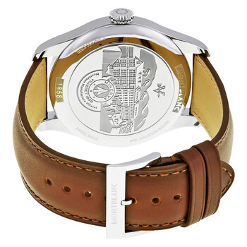 Stainless steel case with a brown (Italian full grain calfskin) leather strap. Fixed stainless steel bezel. Black dial with luminous rhodium-plated cathedral-style hands and Arabic numeral hour markers. Arabic numeral minute markers (at 5 minute intervals). Minute markers around the outer rim. Dial Type: Analog. Luminescent hands and markers. One subdial displaying: small seconds. MontBlanc calibre MB 24.16 automatic movement, based upon Sellita SW260-1, containing 31 Jewels, bitting at 28800 vph, and has a power reserve of approximately 38 hours. Scratch resistant sapphire crystal. Pull / push crown. Solid case back. Round case shape. Case size: 47 mm. Case thickness: 12.2 mm. Band width: 22 mm. Tang clasp. Water resistant at 30 meters / 100 feet. Functions: hour, minute, second. 1858 Series. Luxury watch style. Watch label: Swiss Made. MontBlanc 1858 Automatic Black Dial Men's Watch 115073.