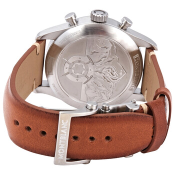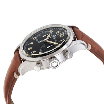Stainless steel case with a brown leather strap. Fixed stainless steel bezel. Black dial with luminous silver-tone cathedral-style hands and Arabic numeral hour markers. Arabic numeral minute markers (at 5 minute intervals). Minute markers around the outer rim. Dial Type: Analog. Luminescent hands and markers. Chronograph - two sub-dials displaying: 60 second and 30 minute. Montblanc calibre MB 25.11 automatic movement with a 48-hour power reserve. Scratch resistant sapphire crystal. Pull / push crown. Solid case back. Round case shape. Case size: 42 mm. Case thickness: 14.55 mm. Band width: 22 mm. Push button clasp. Water resistant at 100 meters / 330 feet. Functions: chronograph, hour, minute, second. 1858 Series. Luxury watch style. Watch label: Swiss Made. Montblanc 1858 Chronograph Automatic Black Dial Men's Watch 117836.