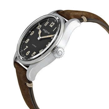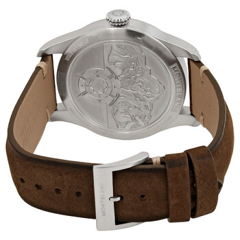 Stainless steel case with a khaki-green leather strap. Fixed stainless steel bezel. Black dial with luminous silver-tone cathedral-style hands and Arabic numeral hour markers. Arabic numeral minute markers (at 5 minute intervals). Minute markers around the outer rim. Dial Type: Analog. Luminescent hands and markers. MontBlanc calibre MB 24.15 automatic movement, based upon Sellita SW200-1, containing 26 Jewels, bitting at 28800 vph, and has a power reserve of approximately 38 hours. Scratch resistant sapphire crystal. Push / pull crown. Solid case back. Round case shape. Case size: 40 mm. Case thickness: 11 mm. Band width: 20 mm. Tang clasp. Water resistant at 100 meters / 330 feet. Functions: hour, minute. 1858 Collection Series. Luxury watch style. Watch label: Swiss Made. Montblanc 1858 Collection Automatic Black Dial Men's Watch 119907.