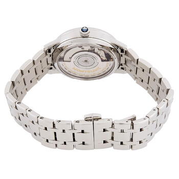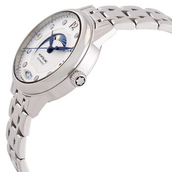 Silver-tone stainless steel case and bracelet. Fixed silver-tone bezel. Silver-white dial with blue hands and crystal-Arabic numeral hour markers. Minute markers around the outer rim. Dial Type: Analog. Date display at the 6 o'clock position. Automatic movement. Scratch resistant sapphire crystal. Pull / push crown. Transparent see through case back. Round case shape, case size: 30 mm. Fold over clasp with a safety release. Water resistant at 30 meters / 100 feet. Functions: hour, minute, second, day/night indicator. Dress watch style. Watch label: Swiss Made. Montblanc Bohème Day Night 30 mm Watch.