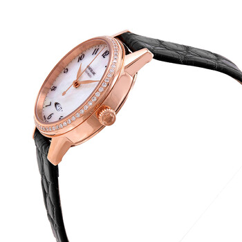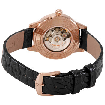 18kt rose gold case with a black leather strap. Fixed 18kt rose gold bezel set with 62 diamonds. Mother of pearl dial with gold-tone hands and Arabic numeral hour markers. Minute markers around the outer rim. Dial Type: Analog. Date display at the 6 o'clock position. Caliber MB 24.10 automatic movement with a 42-hour power reserve. Scratch resistant sapphire crystal. Pull / push crown. Solid case back. Round case shape. Case size: 28 mm. Band width: 14 mm. Tang clasp. Water resistant at 30 meters / 100 feet. Functions: date, hour, minute, second. Bohème Series. Luxury watch style. Watch label: Swiss Made. Montblanc Bohème Automatic Diamond Mother of Pearl Dial Ladies Watch 116501.