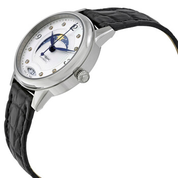 Stainless steel case with a black leather strap. Fixed stainless steel bezel. White dial with blue hands and diamond hour markers. Arabic numerals mark the 3, 9 and 12 o'clock position. Minute markers around the outer rim. Dial Type: Analog. Date display at the 6 o'clock position. Day / night indicator. MontBlanc calibre MB 24.10 automatic movement, containing 21 Jewels, bitting at 28800 vph, and has a power reserve of approximately 42 hours. Scratch resistant sapphire crystal. Pull / push crown. Transparent case back. Round case shape. Case size: 30 mm. Case thickness: 9.41 mm. Strap width: 14 mm. Butterfly clasp. Water resistant at 30 meters / 100 feet. Functions: date, hour, minute, second, day/night indicator. Boheme Series. Luxury watch style. Watch label: Swiss Made. MontBlanc Boheme Day and Night Automatic Ladies Watch 114730.