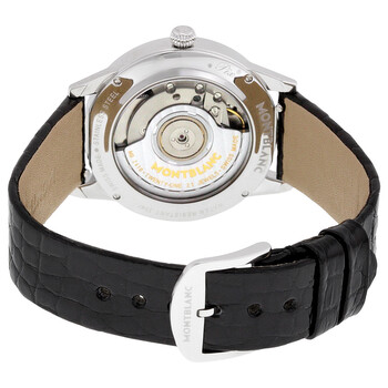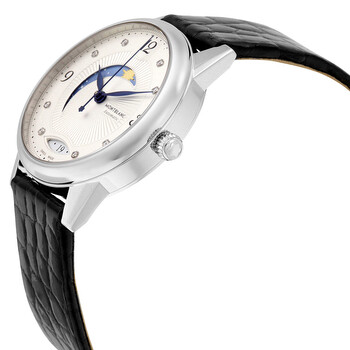 Silver-tone stainless steel case with a black alligator leather strap. Fixed silver-tone stainless steel bezel. Silvery-white guilloche dial with blue leaf-style shape hands and diamond hour markers. Arabic numerals mark the 3, 9 and 12 o'clock positions. Minute markers around the outer rim. Dial Type: Analog. Date display at the 6 o'clock position. One subdial displaying: day/night indicator. MontBlanc Calibre MB 24.10 Automatic movement, containing 21 Jewels, bitting at 28800 vph, and has a power reserve of approximately 42 hours. Scratch resistant sapphire crystal. Pull / push crown. Transparent case back. Round case shape, case size: 34 mm, case thickness: 9.53 mm. Band width: 17 mm. Tang clasp. Water resistant at 30 meters / 100 feet. Functions: date, hour, minute, second, day/night indicator. Boheme Day And Night Series. Luxury watch style. Watch label: Swiss Made. Montblanc Boheme Day and Night Diamond Dial Ladies Watch 112512.