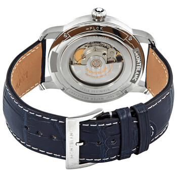 Stainless steel case with a blue (alligator) leather strap. Fixed stainless steel bezel. Blue guilloche dial with luminous silver-tone hands and alternating index and Arabic numeral hour markers. Arabic numeral minute markers (at 10 minute intervals). Minute markers around the outer rim. Dial Type: Analog. Luminescent hands and markers. Date display at the 6 o'clock position. Automatic movement with a 38-hour power reserve. Scratch resistant sapphire crystal. Pull / push crown. Transparent case back. Round case shape. Case size: 42 mm. Case thickness: 10.14 mm. Band width: 20 mm. Tang clasp. Water resistant at 50 meters / 165 feet. Functions: date, hour, minute, second. Heritage Series. Luxury watch style. Montblanc Heritage Automatic Men's Watch 119960.