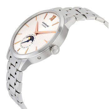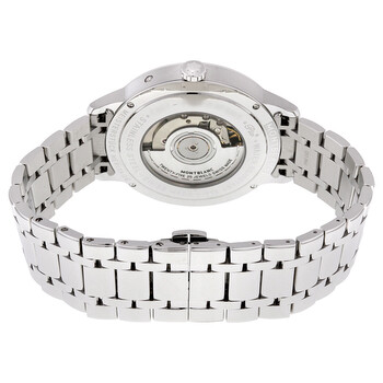 Stainless steel case with a stainless steel bracelet. Fixed stainless steel bezel. Silver dial with rose gold-plated hands and index hour markers. A Roman numeral appears at the 12 o'clock position. Minute markers around the outer rim. Dial Type: Analog. A single combination sub-dial displaying: date and moonphase. MontBlanc calibre MB 29.14 automatic movement with a 42-hour power reserve. Scratch resistant sapphire crystal. Push / pull crown. Skeleton case back. Case size: 43 mm. Case thickness: 10.44 mm. Round case shape. Band width: 19 mm. Deployment clasp. Water resistant at 30 meters / 100 feet. Functions: date, hour, minute, moonphase. Luxury watch style. Watch label: Swiss Made. Montblanc Heritage Spirit Moonphase Automatic Silver Dial Stainless Steel Men's Watch 111621.