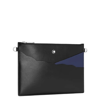 Montblanc Pouch. SKU: 129676. . Color: Black. Size: 11.8" x 0.3" x 7.8". Montblanc Meisterstuck Leather Pouch. Crafted from full-grain calfskin leather, this pouch embodies Montblanc's essence with nib-inspired stitching, a distinctive larger logo, and a front pocket outline honoring Mont Blanc. It features a detachable wrist handle, a coated canvas lining, and a secure metal zipper closure. 100% Calfskin.