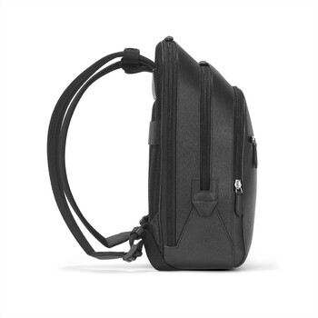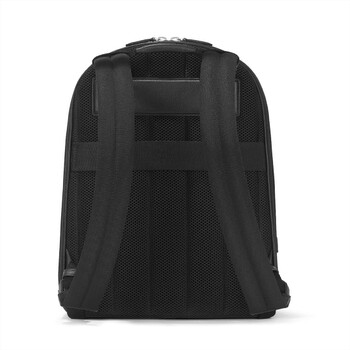 Montblanc Backpack. SKU: 130275. Color: Black. Blending functionality with urban sophistication, this Montblanc backpack is a sleek companion for city life. Crafted from Saffiano-printed leather for an elevated touch, it offers three spacious compartments to organize documents, devices, and writing instruments with ease. A bold update to its design, the exterior compartment showcases the Montblanc emblem in a striking larger size, adding a refined yet modern edge. Material: Calf-skin leather. Lining: Cotton and polyamide lining.