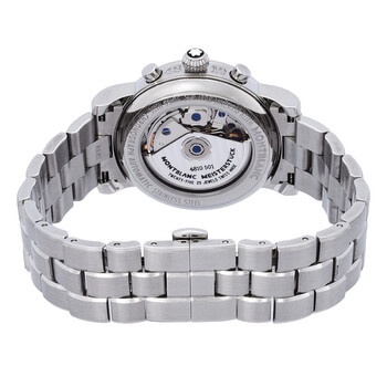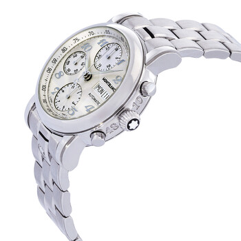 Stainless steel case with a stainless steel link bracelet. Fixed stainless steel bezel. Silver guilloche dial with luminous hands and Arabic numeral hour markers. Minute markers. Tachymeter scale around the outer rim. Luminescent hands and markers. Day and date display appears at the 3 o'clock position. Chronograph - three sub-dials displaying: 12 hours, 30 minutes and 60 seconds sub dials. Automatic movement. Scratch resistant sapphire crystal. Case diameter: 38 mm. Deployment clasp. Water resistant at 30 meters/ 100 feet. Functions: hours, minutes, seconds, calendar, chronograph, tachymeter. Montblanc Star Classic Silver Dial Automatic Chronograph Men's Watch 5222.