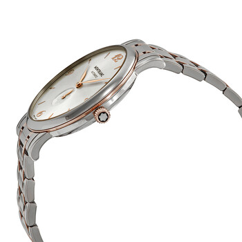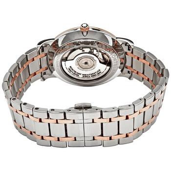 Silver-tone stainless steel case with a two-tone (silver-tone and rose gold-tone) stainless steel and 18kt rose gold bracelet. Fixed silver-tone stainless steel bezel. Silver dial with rose gold-tone leaf-style shape hands and index-Arabic numerals hour markers. Dial Type: Analog. One subdial displaying: small second. MontBlanc Calibre MB 24.08 Automatic movement, based upon ETA 2895-2, containing 27 Jewels, bitting at 28800 vph, and has a power reserve of approximately 42 hours. Scratch resistant sapphire crystal. Pull / push crown. Transparent see through case back. Round case shape, case size: 39 mm, case thickness: 8.90 mm. Butterfly clasp. Water resistant at 30 meters / 100 feet. Functions: hour, minute, second. Star Classique Series. Luxury watch style. Watch label: Swiss Made. MontBlanc Star Classique Silver Dial Automatic Men's Steel and 18kt Rose Gold Watch 107916.