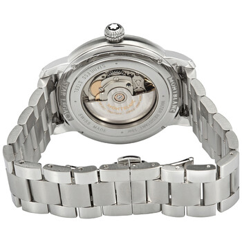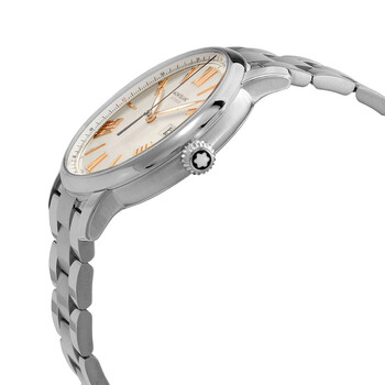 AG 925 sterling silver case with a stainless steel bracelet. Fixed AG 925 sterling silver bezel. Ivory dial with luminous rose gold-tone hands and alternating ndex and Roman numeral hour markers. Arabic numeral minute markers (at 5 minute intervals). Minute markers around the outer rim. Dial Type: Analog. Luminescent hands. Date display at the 3 o'clock position. MontBlanc calibre MB 24.17 automatic movement, based upon Sellita SW200-1, containing 26 Jewels, bitting at 28800 vph, and has a power reserve of approximately 38 hours. Scratch resistant sapphire crystal. Screw down crown. Solid case back. Round case shape. Case size: 43 mm. Case thickness: 11 mm. Band width: 21 mm. Fold over clasp with a push button release. Water resistant at 50 meters / 165 feet. Functions: date, hour, minute, second. Star Legacy Series. Luxury watch style. Watch label: Swiss Made. Montblanc Star Legacy Automatic Ivory Dial Men's Watch 126106.