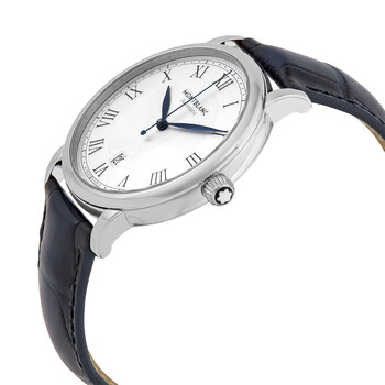 Stainless steel case with a blue leather strap. Fixed stainless steel bezel. White / silver dial with blue hands and Roman numeral hour markers. Minute markers around the outer rim. Dial Type: Analog. Date display at the 6 o'clock position. Caliber MB 24.10 automatic movement with a 42-hour power reserve. Scratch resistant sapphire crystal. Pull / push crown. Transparent case back. Round case shape. Case size: 42 mm. Case thickness: 9.53 mm. Band width: 20 mm. Tang clasp. Water resistant at 30 meters / 100 feet. Functions: date, hour, minute, second. Star Legacy Series. Luxury watch style. Watch label: Swiss Made. Montblanc Star Legacy Automatic Men's Watch 119956.