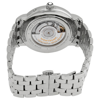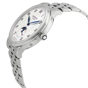 Silver-tone stainless steel case and bracelet. Fixed silver-tone stainless steel bezel. Silvery white dial with blue hands and Arabic numeral hour markers. Minute markers around the outer rim. Dial Type: Analog. Date / moonphase subdials. Caliber MB 29.14 automatic movement with a 42-hour power reserve. Scratch resistant sapphire crystal. Pull / push crown. Transparent case back. Round case shape, case size: 42 mm, case thickness: 10.88 mm. Band width: 20 mm. Fold over clasp. Water resistant at 30 meters / 100 feet. Functions: date, hour, minute, date, moonphase. Star Legacy Moonphase Series. Luxury watch style. Watch label: Swiss Made. Montblanc Star Legacy Moonphase Automatic Silvery White Dial Men's Watch 117326.