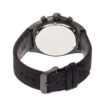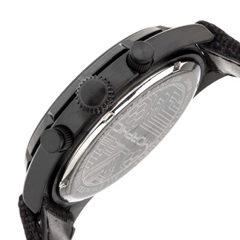 Black-plated stainless steel case with a black leather strap. Uni-directional rotating black-plated bezel. Black dial with black hands and Arabic numeral hour markers. Tachymeter scale around the outer rim. Dial Type: Analog. Luminescent hands and markers. Date display between the 4 and 5 o'clock positions. Chronograph - three sub-dials displaying: 60 second, 30 minute and 24 hour. Quartz movement. Scratch resistant mineral crystal. Solid case back. Round case shape. Case size: 45 mm. Case thickness: 12 mm. Band width: 24 mm. Tang clasp. Water resistant at 50 meters / 165 feet. Functions: chronograph, date, GMT, second time zone, hour, minute, second. M53 Series Series. Sport watch style. Watch label: Japan Movt. Item Variations: MPH5305. Morphic M53 Series Chronograph Black Dial Men's Watch 5305.