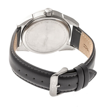 Silver-tone stainless steel case with a grey leather strap. Fixed silver-tone stainless steel bezel. Black dial with silver-tone hands and Arabic numeral and index hour markers. Minute markers around the outer rim. Dial Type: Analog. Luminescent hands and markers. Date display at the 3 o'clock position. Quartz movement. Scratch resistant mineral crystal. Round case shape, case size: 44 mm, case thickness: 11 mm. Band width: 22 mm. Buckle clasp. Water resistant at 50 meters / 165 feet. Functions: date, hour, minute, second. Casual watch style. Watch label: Japan Movt. Item Variations: MPH6301. Morphic M63 Series Black Dial Men's Watch 6301.