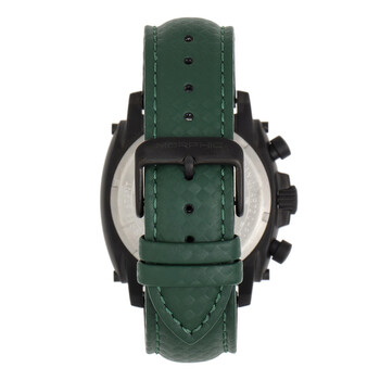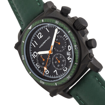 Black stainless steel case with a green genuine leather strap. Fixed green stainless steel bezel. Black dial with silver-tone pencil-style shape hands and Arabic numeral hour markers. Minute scale around the inner rim. Dial Type: Analog. Luminescent hands. Date display between 4 and 5 o'clock position. Chronograph - three sub-dials displaying: 60 small second, 30 minute & 24 hour. Quartz movement. Scratch resistant mineral crystal. Pull / push crown. Solid case back. Square case shape, case size: 44 mm, case thickness: 13 mm. Band width: 22 mm, band length: 9.05 inches. Buckle clasp. Water resistant at 100 meters / 330 feet. Functions: chronograph, date, hour, minute, second, 24 hour. M83 Series Series. Casual watch style. Watch label: Japan Movt. Morphic M83 Series Chronograph Quartz Black Dial Men's Watch MPH8307.