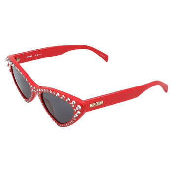 Moschino Sunglasses. Series number: MOS006/S/STR. Color code: 0C9A/IR. Shape: Cat Eye. Lens Width: 52 mm. Lens Bridge: 18 mm. Arm Length: 140 mm. 100% UV protection. Frame Material: Acetate. Frame Color: Red. Lenses Type: Grey. Rim Style: Full-Rim. UPC/EAN code: 716736413365. Moschino Grey Cat Eye Ladies Sunglasses MOS006/S/STR 0C9A/IR 52.