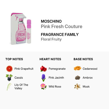 Pink Fresh Couture opens with a lively splash of pink grapefruit, cassis, and lily of the valley, creating a fresh and fruity first impression that feels both vibrant and uplifting. As the scent unfolds, heart notes of juicy pomegranate, delicate pink jacinth, and wild rose bloom, adding a soft floral sweetness that feels feminine and free-spirited.