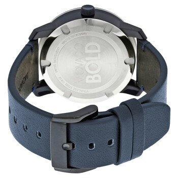 Blue ion-plated stainless steel and TR90 composite case with a navy leather strap. Fixed blue TR90 composite bezel. Blue museum dial with blue hands. No markers. The Movado dot appears at the 12 o'clock position. Dial Type: Analog. Quartz movement. Scratch resistant K1 crystal. Pull / push crown. Solid case back. Case size: 42 mm. Case thickness: 11 mm. Round case shape. Strap width: 20 mm. Tang clasp. Water resistant at 30 meters / 100 feet. Functions: hour, minute,. Casual watch style. Watch label: Swiss Made. Movado Bold Blue Dial Watch 3600370.