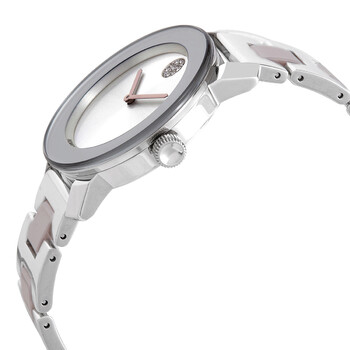 Stainless steel case with a stainless steel bracelet with blush ceramic center links. Fixed stainless steel bezel. Silver metallic dial with blush hands. No markers. The Movado dot appears at the 12 o'clock position. Dial Type: Analog. Quartz movement. Scratch resistant K1 mineral crystal. Pull / push crown. Solid case back. Round case shape. Case size: 36 mm. Fold over clasp with a push button release. Water resistant at 30 meters / 100 feet. Functions: hour, minute. Bold Ceramic Series. Dress watch style. Watch label: Swiss Made. Movado Bold Ceramic Quartz Silver Metallic Dial Ladies Watch 3600702.