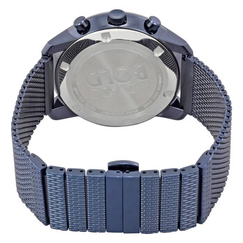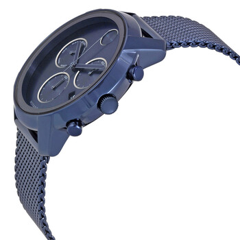 Blue ion-plated stainless steel case with a blue ion-plated stainless steel mesh bracelet. Fixed blue ion-plated stainless steel bezel. Blue sunray dial with blue hands and index hour markers. Movado dot appears at the 12 o'clock position. Dial Type: Analog. Date display at the 4 o'clock position. Three sub-dials displaying: day of the week, 60 second and 30 minute. Quartz movement. Scratch resistant K1 mineral crystal. Pull / push crown. Solid case back. Round case shape, case size: 44 mm, case thickness: 10.1 mm. Band width: 22 mm. Sliding buckle clasp. Water resistant at 30 meters / 100 feet. Functions: chronograph, date, hour, minute, second. Additional Info: in general, withstands splashes or brief immersion in water, but not suitable for swimming or bathing. Bold Series. Casual watch style. Watch label: Swiss Made. Movado Bold Chronograph Blue Dial Men's Watch 3600403.