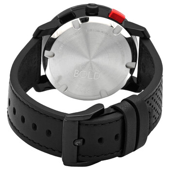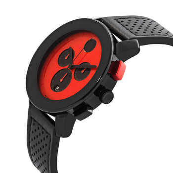 Black tr90 composite and stainless steel case with a black leather strap. Fixed black tr90 composite and stainless steel bezel. Red dial with black hands and index hour markers. Dial Type: Analog. Date display at the 6 o'clock position. Chronograph - three sub-dials displaying: 60 second, 60 minute and 12 hour. Quartz movement. Scratch resistant K1 crystal. Pull / push crown. Solid case back. Round case shape, case size: 43.5 mm. Tang clasp. Water resistant at 30 meters / 100 feet. Functions: chronograph, hour, minute, second. Bold Series. Sport watch style. Watch label: Swiss Made. Movado Bold Chronograph Quartz Red Dial Men's Watch 3600765.