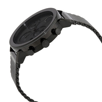 Black IP stainless steel case with a black IP stainless steel mesh bracelet. Fixed black IP stainless steel bezel. Black dial with black hands and index hour markers. Dial Type: Analog. Date display at the 4 o'clock position. Three sub-dials displaying: 60 second, 30 minute and day. Quartz movement. Scratch resistant K1 mineral crystal. Pull / push crown. Solid case back. Round case shape, case size: 42 mm. Sliding clasp. Water resistant at 50 meters / 165 feet. Functions: chronograph, date, day, hour, minute, second. Bold Evolution Series. Sport watch style. Watch label: Swiss Made. Movado Bold Evolution Chronograph Quartz Black Dial Men's Watch 3600810.