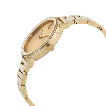 Yellow gold-tone stainless steel case and bracelet. Fixed yellow gold-tone stainless steel bezel. Gold-tone dial with yellow gold-tone hands. Dial Type: Analog. Quartz movement. Solid case back. Round case shape, case size: 34 mm. Deployment with push button release clasp. Water resistant at 30 meters / 100 feet. Functions: hour, minute. Bold Evolution Series. Casual watch style. Watch label: Swiss Made. Movado Bold Evolution Quartz Gold Dial Ladies Watch 3600822.