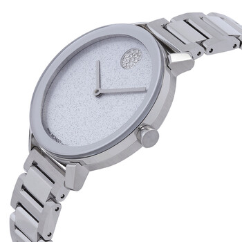 Silver-tone stainless steel case and bracelet. Fixed silver-tone stainless steel bezel. Multi-color dial with silver-tone hands. Dial Type: Analog. Quartz movement. Scratch resistant K1 crystal. Solid case back. Round case shape, case size: 34 mm. Fold over clasp with a safety release. Water resistant at 30 meters / 100 feet. Functions: hour, minute. Bold Evolution Series. Casual watch style. Watch label: Swiss Made. Movado Bold Evolution Quartz Ladies Watch 3600827.
