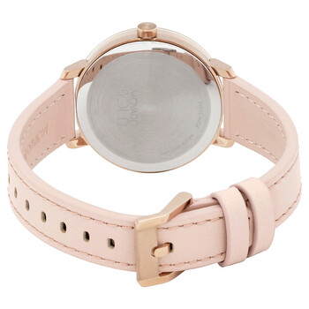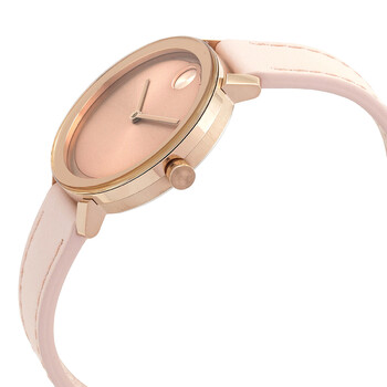 Rose gold IP stainless steel case with a blush pink leather strap. Fixed rose gold IP stainless steel bezel. Rose gold dial with rose gold-tone hands. No markers. Movado dot appears at the 12 o'clock position. Dial Type: Analog. Quartz movement. Scratch resistant K1 crystal. Pull / push crown. Solid case back. Round case shape, case size: 34 mm. Tang clasp. Water resistant at 30 meters / 100 feet. Functions: hour, minute. Bold Evolution Series. Casual watch style. Watch label: Swiss Made. Movado Bold Evolution Quartz Rose Gold Dial Ladies Watch 3600889.