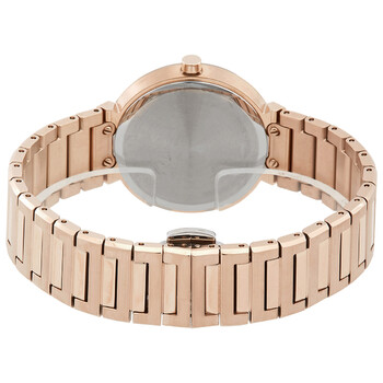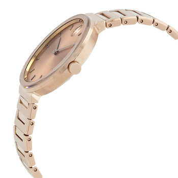 Rose gold IP stainless steel case and bracelet. Fixed rose gold IP stainless steel bezel. Rose gold dial with rose gold-tone hands and index hour markers. Movado dot appears at the 12 o'clock position. Dial Type: Analog. Quartz movement. Scratch resistant K1 crystal. Pull / push crown. Solid case back. Round case shape, case size: 34 mm. Deployment clasp. Water resistant at 30 meters / 100 feet. Functions: hour, minute. Bold Horizon Series. Dress watch style. Watch label: Swiss Made. Movado Bold Horizon Quartz Rose Gold Dial Ladies Watch 3601089.