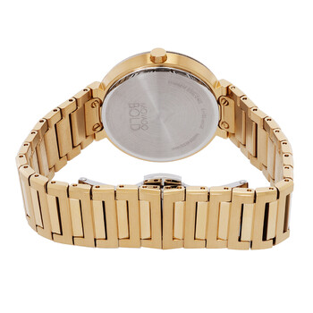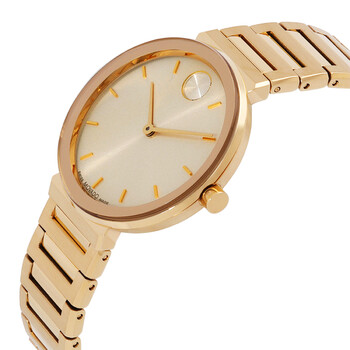 Yellow gold IP stainless steel case and bracelet. Fixed yellow gold IP stainless steel bezel. Taupe dial with gold-tone hands and index hour markers. Movado dot appears at the 12 o'clock position. Dial Type: Analog. Quartz movement. Scratch resistant K1 crystal. Pull / push crown. Solid case back. Round case shape, case size: 34 mm. Deployment clasp. Water resistant at 30 meters / 100 feet. Functions: hour, minute. Bold Horizon Series. Dress watch style. Watch label: Swiss Made. Movado Bold Horizon Quartz Taupe Dial Ladies Watch 3601088.