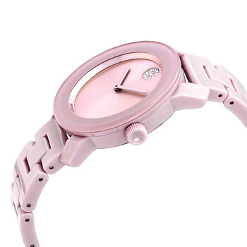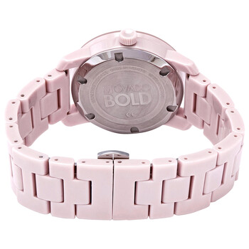 Blush ceramic case and bracelet. Fixed pink ceramic bezel. Pink museum dial with blush hands. No markers. Crystal-set Movado dot appears at the 12 o'clock position. Dial Type: Analog. Quartz movement. Scratch resistant K1 crystal. Pull / push crown. Solid case back. Round case shape, case size: 36 mm. Fold over clasp with a push button release. Water resistant at 30 meters / 100 feet. Functions: hour, minute. Bold Series. Dress watch style. Watch label: Swiss Made. Movado Bold Pink Crystal Dial Ladies Watch 3600536.