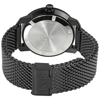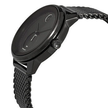 Black ion-plated stainless steel case with a black ion-plated stainless steel mesh bracelet. Fixed black ion-plated bezel. Black dial with black hands and index hour markers. Movado dot appears at the 12 o'clock position. Minute markers around the outer rim. Dial Type: Analog. Small seconds sub-dial. Quartz movement. Scratch resistant K1 mineral crystal. Pull / push crown. Solid case back. Round case shape. Case size: 45 mm. Case thickness: 10.9 mm. Band width: 22 mm. Fold over slip through clasp. Water resistant at 30 meters / 100 feet. Functions: hour, minute, small seconds. Bold Series. Sport watch style. Watch label: Swiss Made. Movado Bold Quartz Black Dial Men's Watch 3600767.