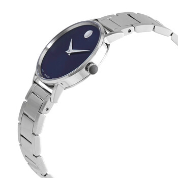 Silver-tone stainless steel case and bracelet. Fixed silver-tone stainless steel bezel. Blue dial with silver-tone hands. No markers. Movado dot appears at the 12 o'clock positions. Dial Type: Analog. Quartz movement. Scratch resistant K1 mineral crystal. Pull / push crown. Solid case back. Round case shape, case size: 28 mm. Fold over clasp. Water resistant at 30 meters / 100 feet. Functions: hour, minute. Bold Series. Casual watch style. Watch label: Swiss Made. Movado Bold Quartz Blue Dial Ladies Watch 0607235.