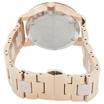 Rose gold-tone stainless steel case with a rose gold-tone stainless steel and ceramic bracelet. Fixed rose gold-tone stainless steel bezel. Pink dial with rose gold-tone hands. Dial Type: Analog. Quartz movement. Solid case back. Round case shape, case size: 36.3 mm. Fold over clasp with a safety release. Water resistant at 30 meters / 100 feet. Functions: hour, minute. Bold Series. Casual watch style. Watch label: Swiss Made. Movado Bold Quartz Pink Dial Ladies Watch 3600799.