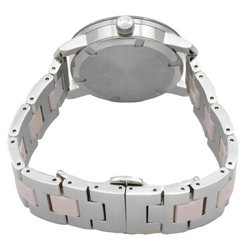Silver-tone stainless steel case with a two-tone (silver-tone and rose gold-tone) stainless steel and ceramic bracelet. Fixed silver-tone stainless steel bezel. Silver-tone dial with rose gold-tone hands. Dial Type: Analog. Quartz movement. Solid case back. Round case shape, case size: 36 mm. Fold over clasp with a safety release. Water resistant at 30 meters / 100 feet. Functions: hour, minute. Bold Series. Casual watch style. Watch label: Swiss Made. Movado Bold Quartz Silver Dial Ladies Watch 3600801.