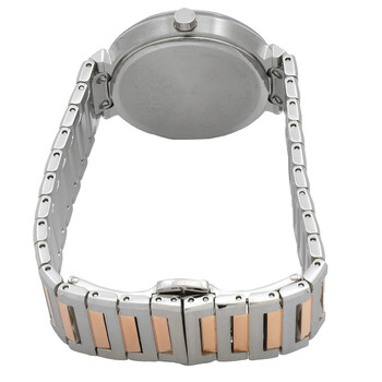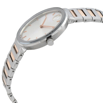 Silver-tone stainless steel case with a two-tone (silver-tone and rose gold-tone) stainless steel bracelet. Fixed silver-tone stainless steel bezel. Silver dial with rose gold-tone hands and index hour markers. Movado dot appears at the 12 o'clock position. Dial Type: Analog. Quartz movement. Scratch resistant K1 crystal. Pull / push crown. Solid case back. Round case shape, case size: 34 mm. Deployment with push button release clasp. Water resistant at 30 meters / 100 feet. Functions: hour, minute. Bold Series. Casual watch style. Watch label: Swiss Made. Movado Bold Quartz Silver Dial Ladies Watch 3601146.