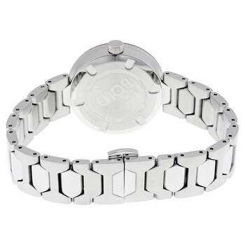Stainless steel case with a stainless steel bracelet. Fixed stainless steel bezel. Silver dial with silver-tone hands. No markers. The Movado dot appears at the 12 o'clock position. Dial Type: Analog. Quartz movement. Scratch resistant K1 mineral crystal. Pull / push crown. Solid case back. Case size: 32 mm. Case thickness: 8 mm. Round case shape. Bracelet width: 14.5 mm. Deployment clasp. Water resistant at 30 meters / 100 feet. Functions: hour, minute,. Casual watch style. Movado Bold Silver Dial Ladies Watch 3600381.