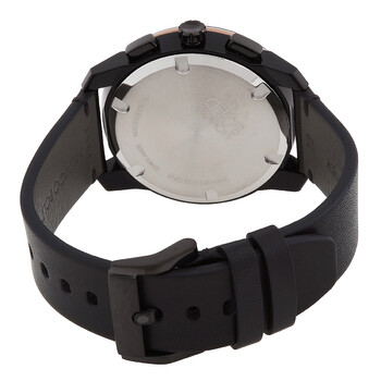 Black tr90 composite case with a black leather strap. Fixed black tr90 composite bezel. Black dial with rose gold-tone hands and index hour markers. Minute markers around the outer rim. Dial Type: Analog. Date display at the 6 o'clock position. Chronograph - three sub-dials displaying: 60 second, 30 minute and 12 hour. Quartz movement. Scratch resistant K1 crystal. Pull / push crown. Solid case back. Round case shape, case size: 43.5 mm. Buckle clasp. Water resistant at 50 meters / 165 feet. Functions: chronograph, date, hour, minute, second. Bold Tr90 Series. Sport watch style. Watch label: Swiss Made. Movado Bold TR90 Chronograph Quartz Black Dial Men's Watch 3601114.