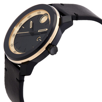 Black tr90 composite case with a black leather strap. Fixed black tr90 composite bezel. Black dial with black hands and index hour markers. Movado dot appears at the 12 o'clock position. Minute markers around the outer rim. Dial Type: Analog. Date display at the 3 o'clock position. Quartz movement. Scratch resistant K1 crystal. Pull / push crown. Solid case back. Round case shape, case size: 42 mm. Buckle clasp. Water resistant at 30 meters / 100 feet. Functions: date, hour, minute, second. Bold Tr90 Series. Casual watch style. Watch label: Swiss Made. Movado Bold TR90 Quartz Black Dial Unisex Watch 3601130.