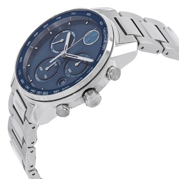 Silver-tone stainless steel case and bracelet. Fixed tachymeter scale blue stainless steel bezel. Blue dial with silver-tone hands and index hour markers. Minute markers around the outer rim. Dial Type: Analog. Luminescent hands and markers. Date display at the 4 o'clock position. Quartz movement. Solid case back. Round case shape, case size: 44 mm. Fold over clasp with a safety release. Water resistant at 50 meters / 165 feet. Functions: date, day, hour, minute, second. Bold Verso Series. Casual watch style. Watch label: Swiss Made. Movado Bold Verso Quartz Blue Dial Men's Watch 3600865.