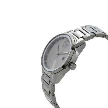 Gunmetal IP stainless steel case and bracelet. Fixed gunmetal IP stainless steel bezel. Gunmetal dial with gunmetal hands and index hour markers. Minute markers around the outer rim. Movado dot appears at the 12 o'clock position. Dial Type: Analog. Luminescent hands and markers. Date display at the 3 o'clock position. Quartz movement. Scratch resistant K1 mineral crystal. Pull / push crown. Solid case back. Round case shape, case size: 42 mm. Deployment clasp. Water resistant at 30 meters / 100 feet. Functions: date, hour, minute, second. Bold Verso Series. Dress watch style. Watch label: Swiss Made. Movado Bold Verso Quartz Gunmetal Dial Men's Watch 3600860.