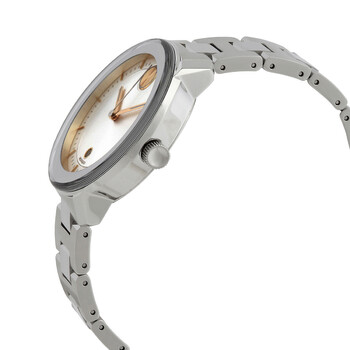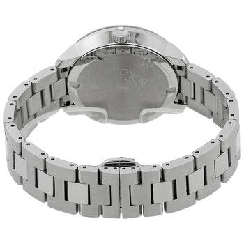 Silver-tone stainless steel case and bracelet. Fixed bezel. Silver-toned metallic dial with rose gold-tone hands and index hour markers. Dial Type: Analog. Date display at the 6 o'clock position. Quartz movement. Scratch resistant K1 mineral crystal. Pull / push crown. Solid case back. Round case shape, case size: 38 mm. Deployment clasp. Water resistant at 30 meters / 100 feet. Functions: date, hour, minute, second. Bold Verso Series. Watch label: Swiss Made. Movado BOLD Verso Quartz Ladies Watch 3600747.