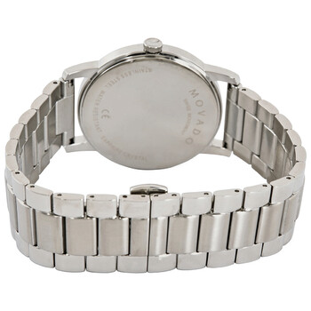 Stainless steel case and bracelet. Fixed stainless steel bezel. Navy dial with silver-tone dauphine-style hands. No markers. The Movado dot appears at the 12 o'clock position. Dial Type: Analog. Quartz movement. Scratch resistant sapphire crystal. Pull / push crown. Solid case back. Round case shape. Case size: 39 mm. Case thickness: 8 mm. Band width: 20 mm. Butterfly clasp. Water resistant at 30 meters / 100 feet. Functions: hour, minute. Classic Museum Series. Casual watch style. Watch label: Swiss Movt. Movado Classic Museum Quartz Navy Dial Men's Watch 2100015.