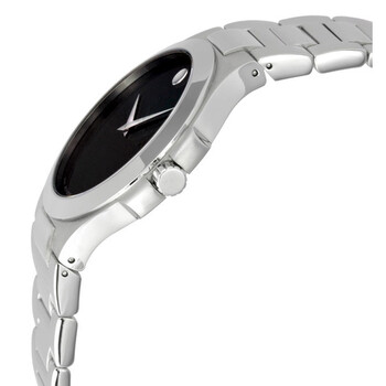 Stainless steel case with a stainless steel bracelet. Fixed stainless steel bezel. Black dial with silver-tone hands. No markers. The Movado dot appears at the 12 o'clock position. Dial Type: Analog. Quartz movement. Scratch resistant sapphire crystal. Pull / push crown. Solid case back. Round case shape. Case size: 39 mm. Case thickness: 5 mm. Band length: 8 inches. Deployment clasp. Water resistant at 30 meters / 100 feet. Functions: hour, minute. Corporate Exclusive Series. Dress watch style. Watch label: Swiss Made. Movado Corporate Exclusive Black Dial Men's Watch 0606163.