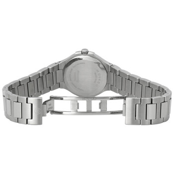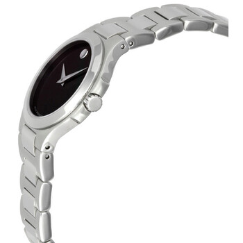 Stainless steel case with a stainless steel bracelet. Fixed stainless steel bezel. Black dial with silver-tone hands. No markers. The signature Movado Dot appears at the 12 o'clock position. Quartz movement. Scratch resistant sapphire crystal. Push / pull crown. Solid case back. Case diameter: 28 mm. Case thickness: 7 mm. Hidden fold over clasp. Water resistant at 30 meters/ 100 feet. Movado Corporate Exclusive Ladies Watch 0606164.