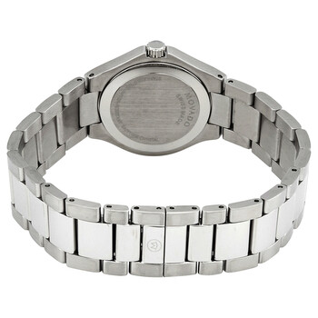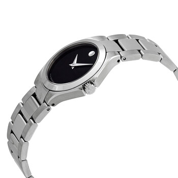 Stainless steel case with a stainless steel bracelet. Fixed stainless steel bezel. Black dial with silver-tone dauphine-style hands. No markers. The Movado dot appears at the 12 o'clock position. Dial Type: Analog. Quartz movement. Scratch resistant sapphire crystal. Pull / push crown. Solid case back. Round case shape. Case size: 28 mm. Case thickness: 6 mm. Band width: 14 mm. Hidden fold over clasp. Water resistant at 30 meters / 100 feet. Functions: hour, minute. Dress watch style. Watch label: Swiss Made. Movado Defio Quartz Black Dial Ladies Watch 0607308.