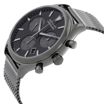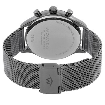 Grey IP stainless steel case and bracelet. Fixed grey IP stainless steel bezel. Black dial with index hour markers. Minute markers around the outer rim. Dial Type: Analog. Luminescent hands and markers. Date display between 4 and 5 o'clock position. Three sub-dials displaying: 60 second, 30 minute and day. Quartz movement. Scratch resistant sapphire crystal. Pull / push crown. Solid case back. Round case shape, case size: 43 mm. Water resistant at 50 meters / 165 feet. Functions: chronograph, date, hour, minute, second. Heritage Series. Sport watch style. Watch label: Swiss Made. Movado Heritage Chronograph Quartz Black Dial Men's Watch 3650153.