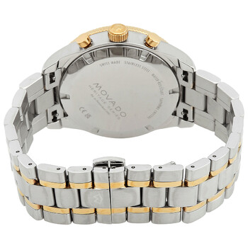 Silver-tone stainless steel case and bracelet. Blue ceramic bezel. Blue dial with yellow gold-tone hands and index hour markers. Minute markers around the outer rim. Dial Type: Analog. Luminescent hands and markers. Date display at the 6 o'clock position. Chronograph - three sub-dials displaying: 60 second, 30 minute and 12 hour. Quartz movement. Round case shape, case size: 42 mm. Fold over clasp with a safety release. Functions: chronograph, date, hour, minute, second. Heritage Series. Casual watch style. Watch label: Swiss Made. Movado Heritage Chronograph Quartz Blue Dial Men's Watch 3650126.