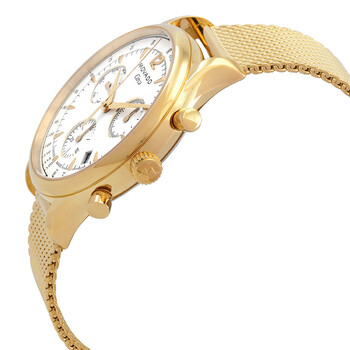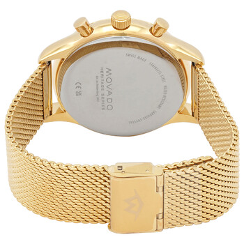 Yellow gold IP stainless steel case with a yellow gold IP stainless steel mesh bracelet. Fixed yellow gold IP stainless steel bezel. White dial with gold-tone hands and index hour markers. Minute markers around the outer rim. Dial Type: Analog. Date display between 4 and 5 o'clock position. Quartz movement. Scratch resistant sapphire crystal. Pull / push crown. Solid case back. Round case shape, case size: 43 mm. Sliding clasp. Water resistant at 50 meters / 165 feet. Functions: chronograph, date, day, hour, minute, second. Heritage Series. Sport watch style. Watch label: Swiss Made. Movado Heritage Chronograph Quartz White Dial Men's Watch 3650138.